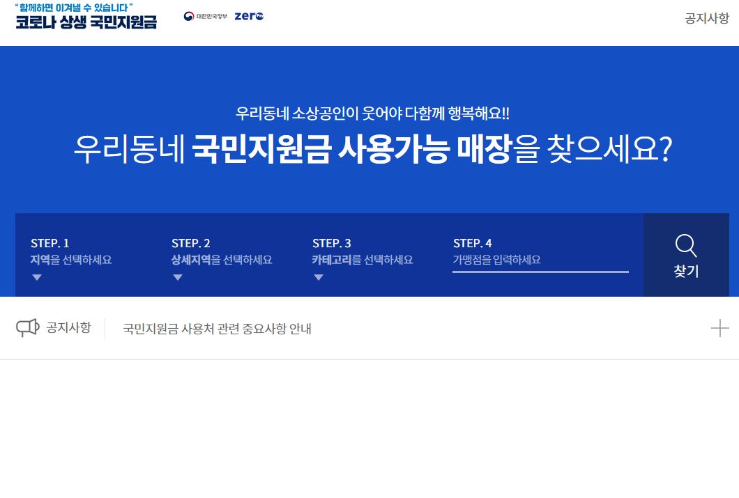 우리동네에서 쓸 수 있는 국민지원금 사용가능 매장을 직접 찾을 수 있습니다.